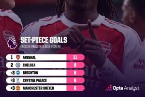 据opta数据统计,本赛季阿森纳已通过定位球打入11粒进球,位列英超第1。