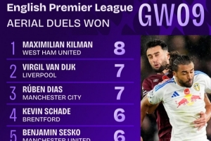 英超第9轮赢得空中对抗次数榜: