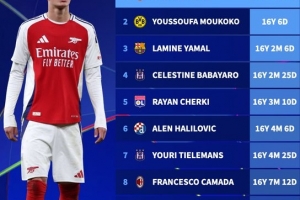 欧冠历史最年轻出场球员排行:道曼居首,穆科科、亚马尔二三位